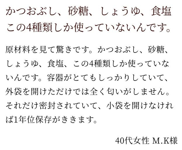 杉樽仕込み特撰下総醤油、クリスマス島の天日海水塩、国内産砂糖、厳選本枯鰹節(本節を使用)という安全な原材料のみを使用して作りました。