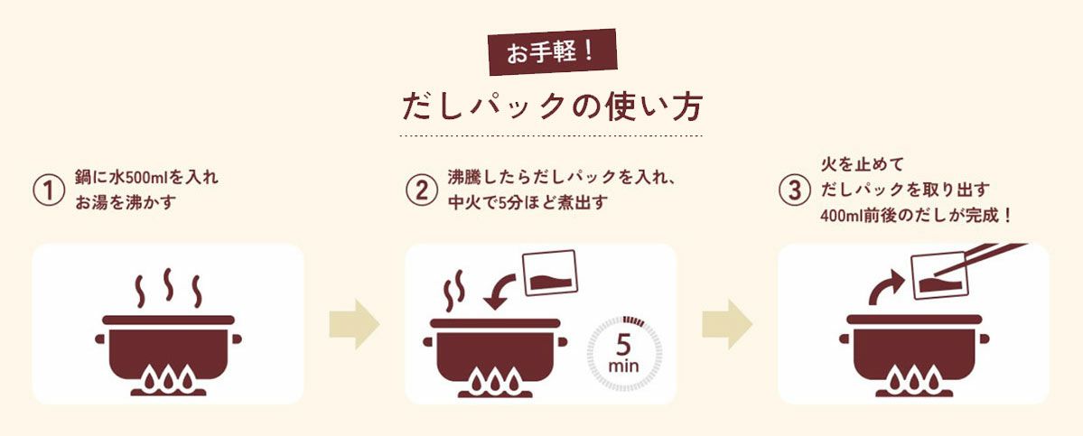 沸騰したお湯にパックを入れ、数分間煮出してから袋を取り除くだけで本格的なだしが楽しめます。