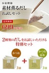 | 内容量 | ●素材薫るだし(かつお)10g×3袋 ●素材薫るだし(かつお・昆布)10g×3袋 |