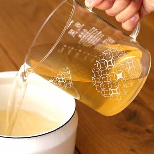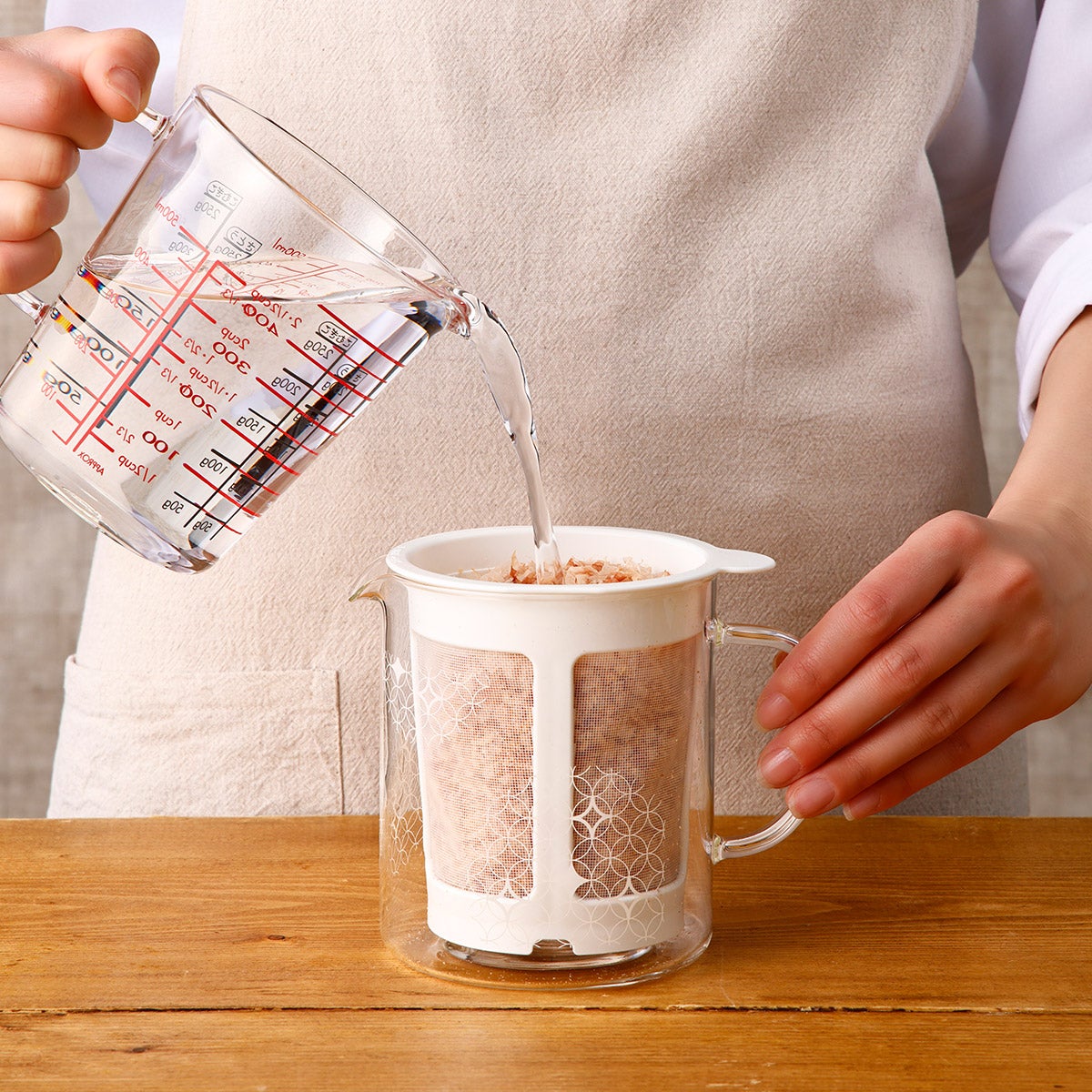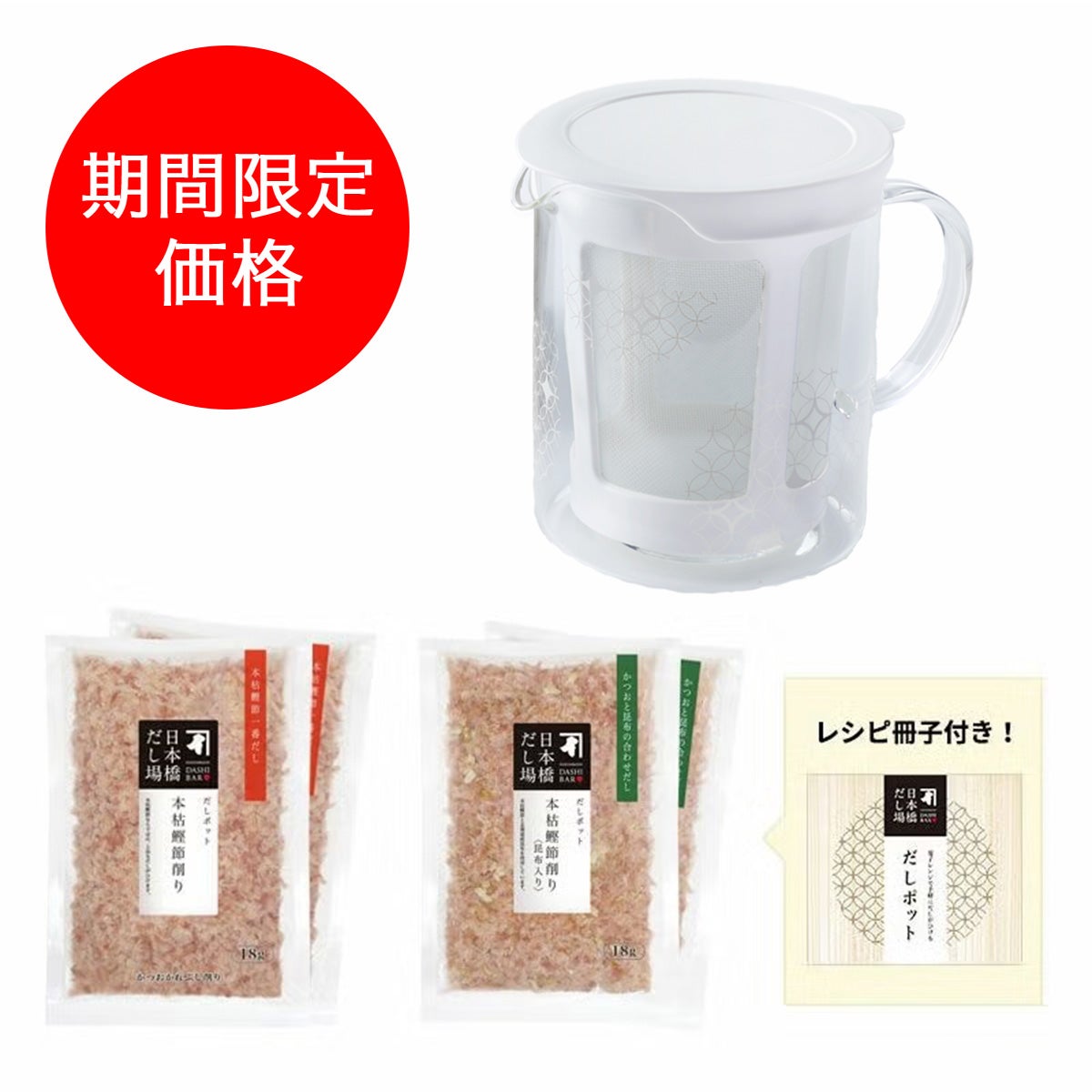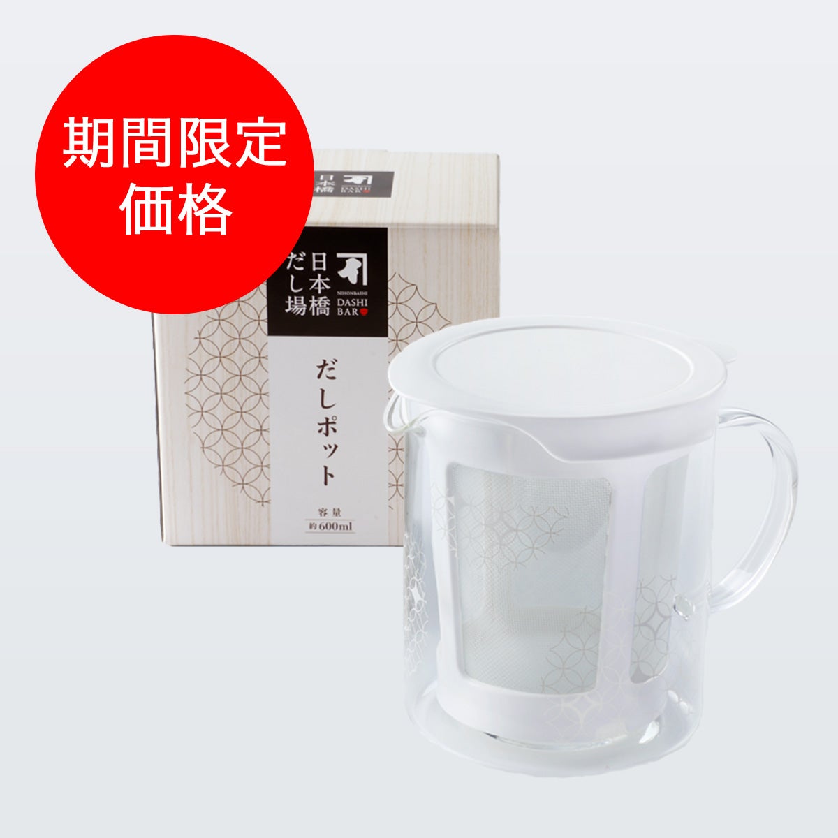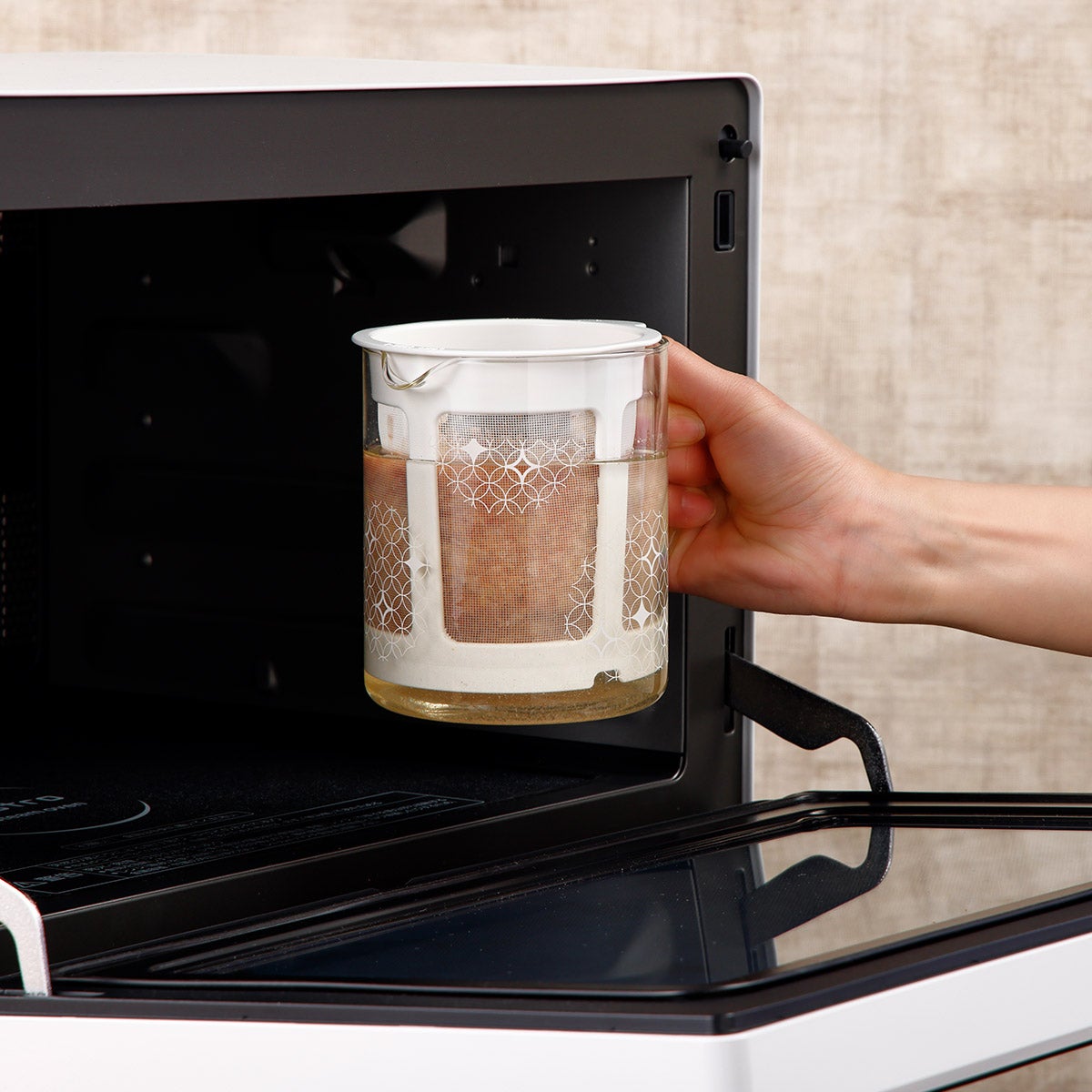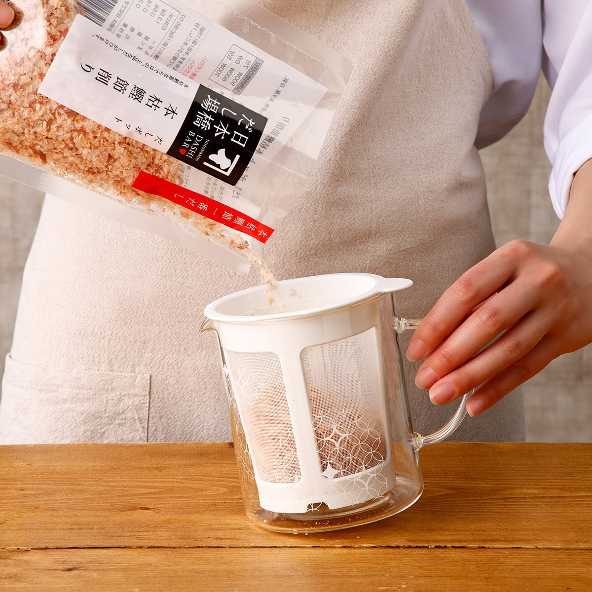 水とかつお節を入れて、電子レンジでチンするだけで、本格だしがひけます。ポットの底まで届く、深いこし器が、おいしいだしをひくポイントです。