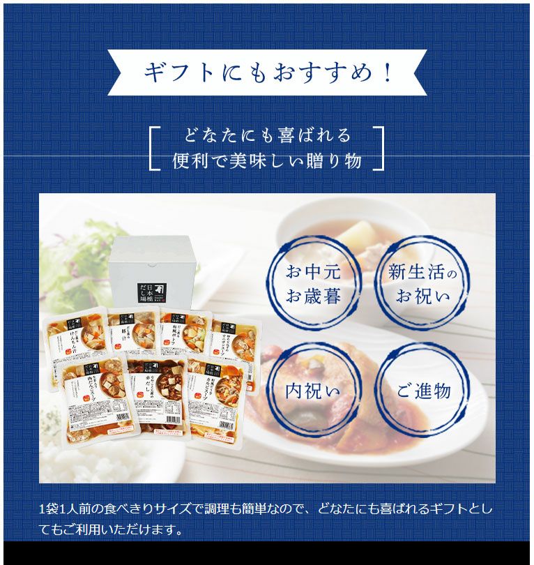 他の画像を見る 冷凍便 税率8% 日本橋だし場の味をご家庭で 【日本橋だし場】 だしスープ詰合せ 7袋入り (送料無料) <冷凍・Y> 販売価格: ¥ 5,400 税込 お気に入りに登録する 販売期間 2026/01/05 10:00 〜