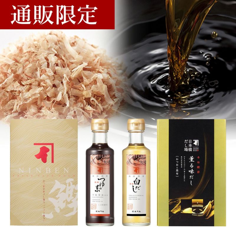 内容量 | ・鰹節フレッシュパックゴールド(ソフト削り・血合い抜き)2.5g×8袋 ・本枯鰹節つゆの素特撰200ml ・本枯鰹節白だし特撰200ml ・薫る味だし(かつおと昆布)8g×16袋入り |