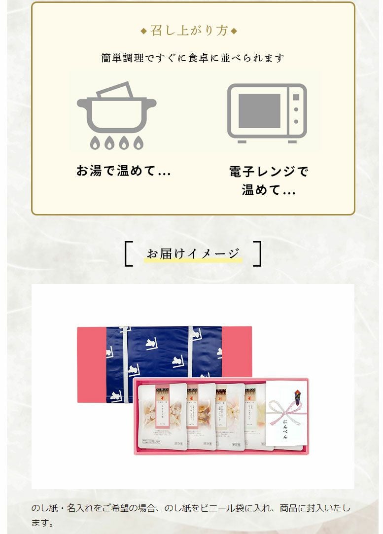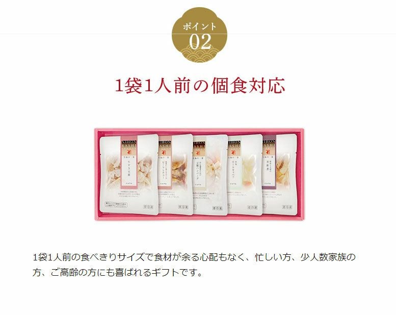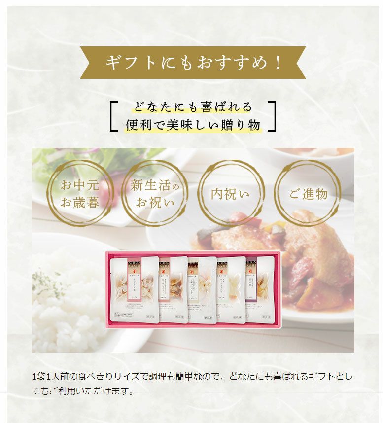 他の画像を見る 冷凍便 税率8% 大切な方への贈り物にとっても人気! 至福の一菜 惣菜詰合せ (5袋入り) 【送料無料】<冷凍・Y> 販売価格: ¥ 5,400 税込 お気に入りに登録する 販売期間 2026/01/05 10:00 〜