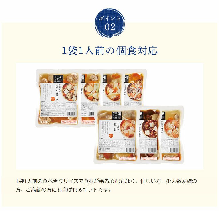 他の画像を見る 冷凍便 税率8% 日本橋だし場の味をご家庭で 【日本橋だし場】 だしスープ詰合せ 7袋入り (送料無料) <冷凍・Y> 販売価格: ¥ 5,400 税込 お気に入りに登録する 販売期間 2026/01/05 10:00 〜