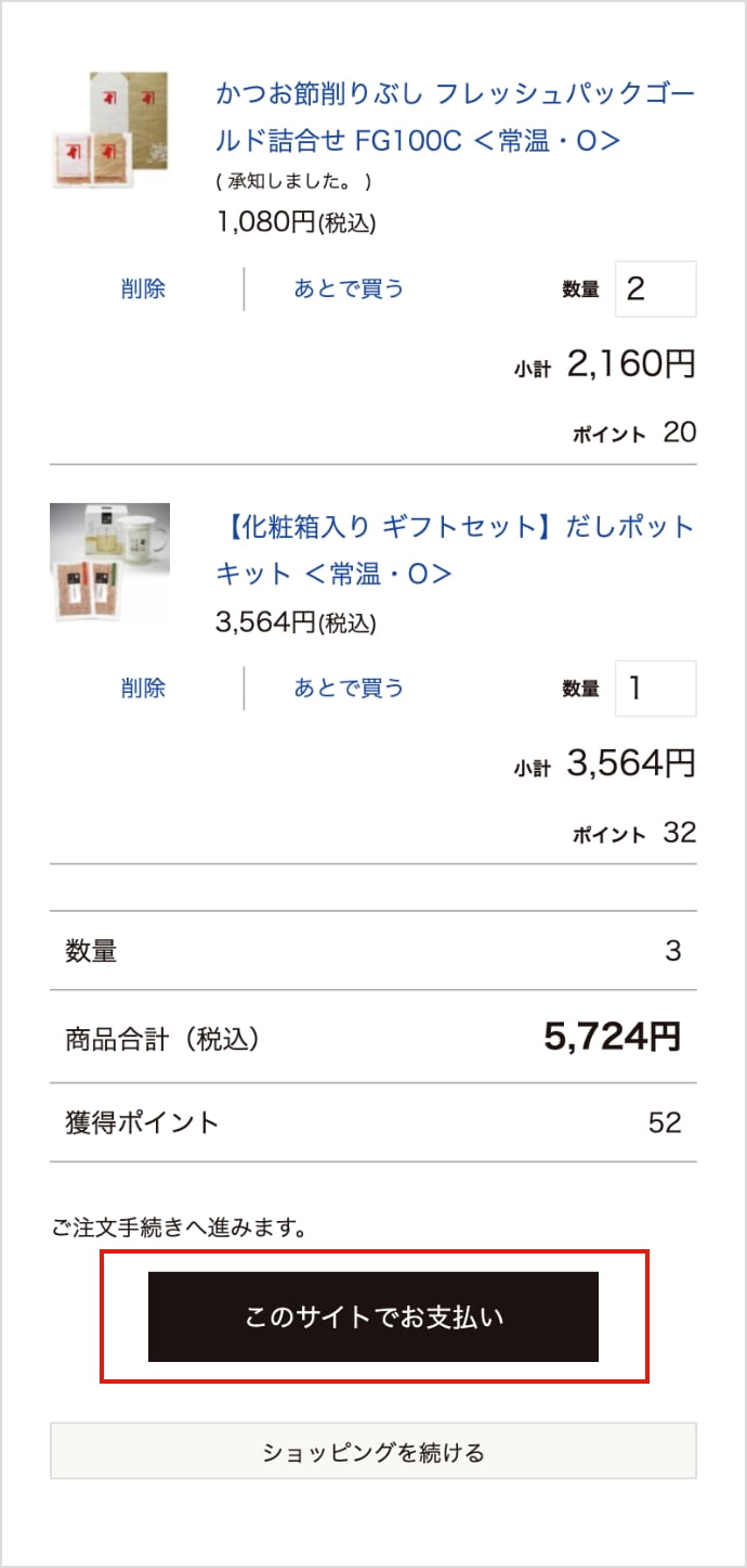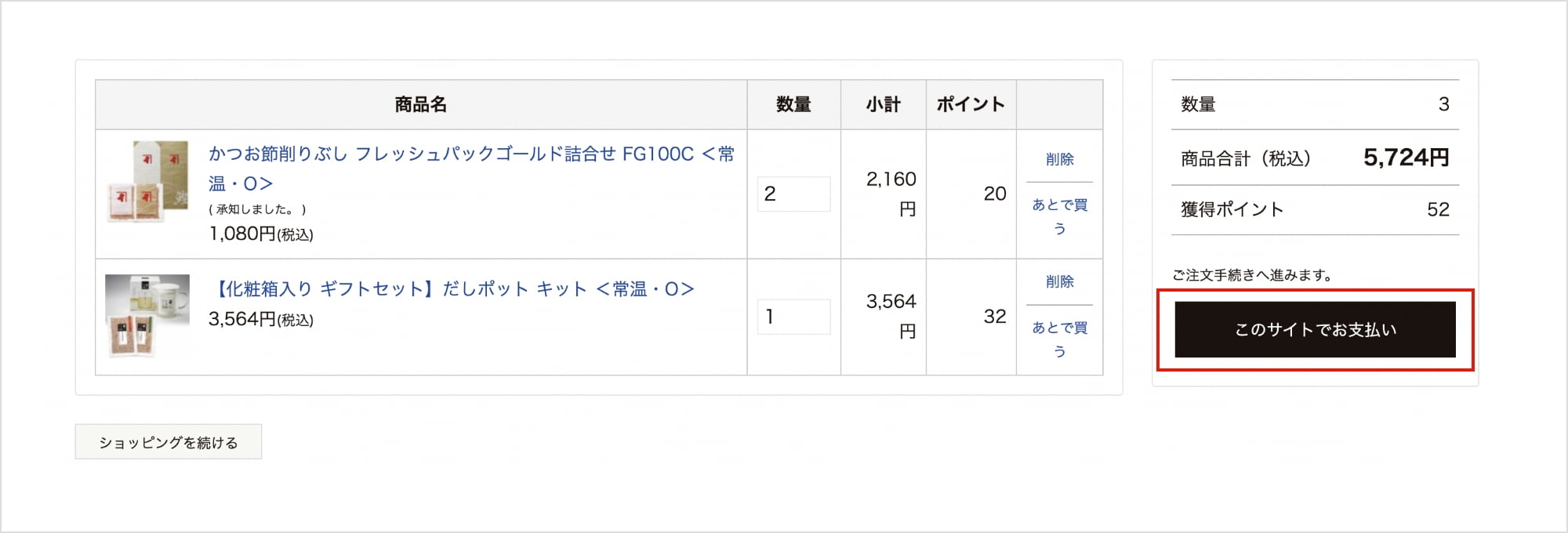 商品をカートに入れたら、[このサイトでお支払い]をクリックしてください。