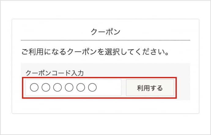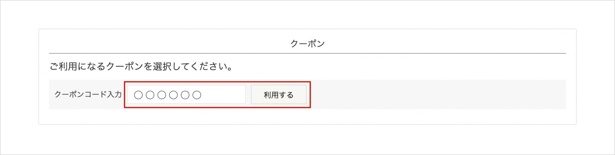 ※クーポンの種類によってすでに付与されている場合は、クーポンコードの入力は不要です。クーポンご利用条件達成で自動的に適用されます。