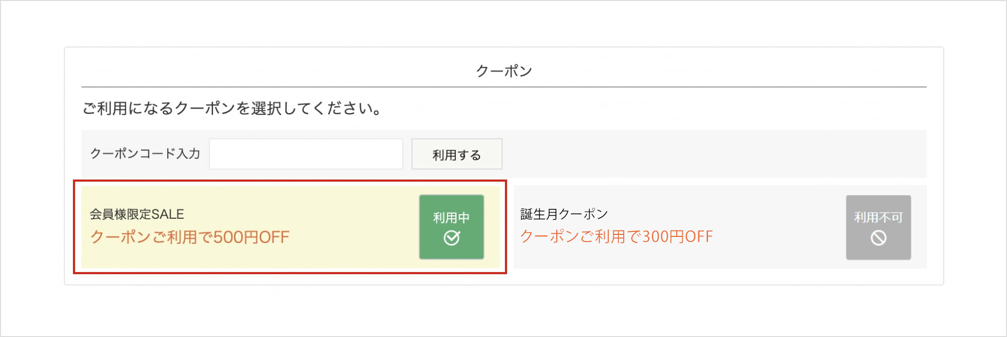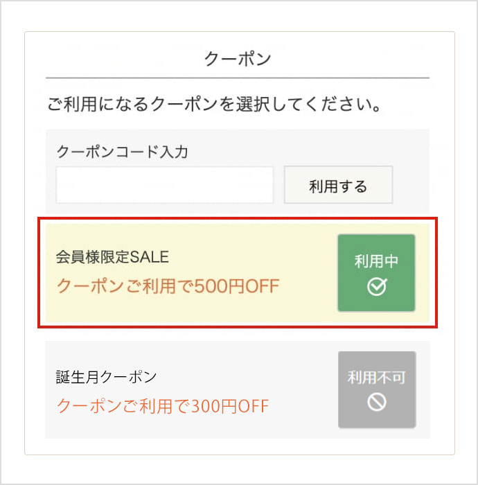 クーポンが適用されます。複数クーポンをお持ちのお客様で、その他のクーポンをご利用されたい場合、[利用中(緑色)]をクリックして解除いただき、再度ご希望のクーポンをお選びください。