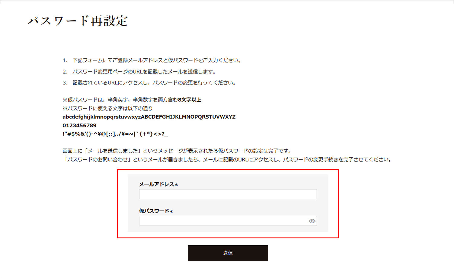 下記のログイン用URLにてメールアドレスと再設定していただきましたパスワードでマイページにログインいただければ完了です。