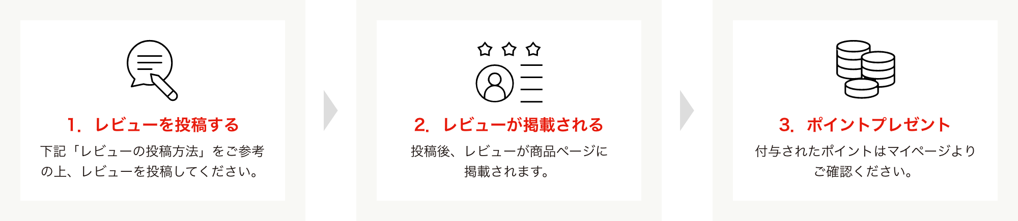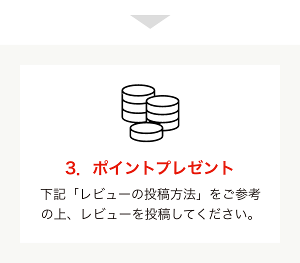 商品到着後、実際に使用されたご感想をお聞かせください。レビュー1件の投稿につき、30ポイントプレゼントいたします。