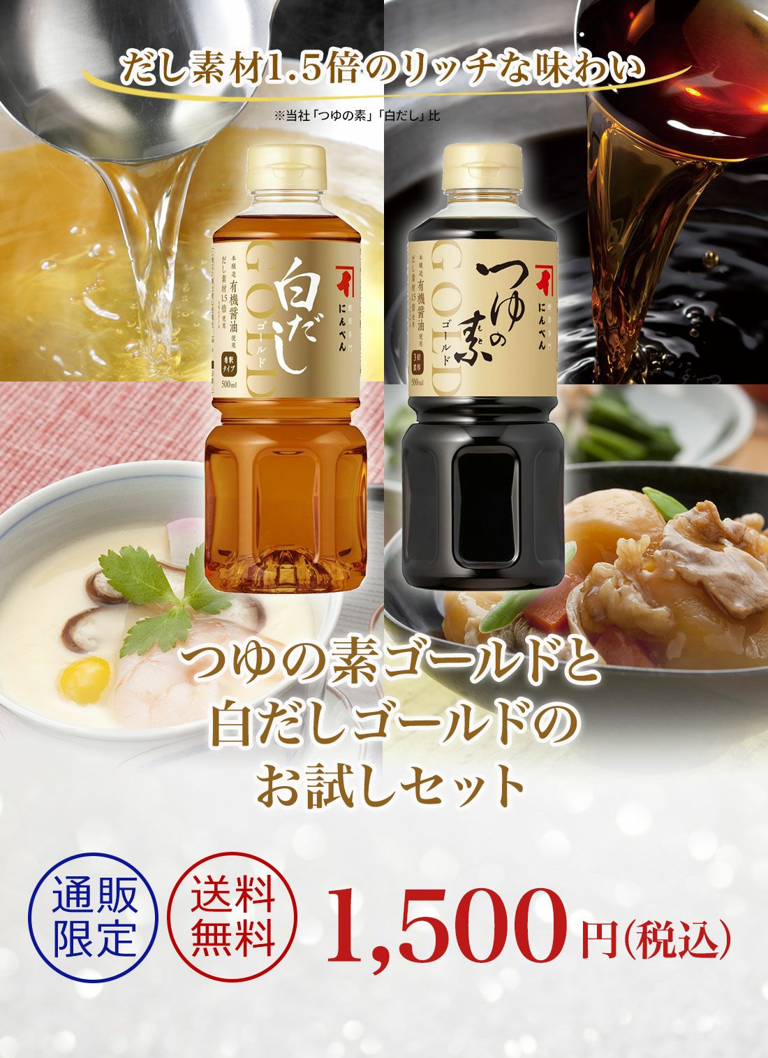 他の画像を見る 常温便 税率8% ネット限定 つゆの素と白だしのプレミアムラインがセットで新発売! 【通販限定】つゆの素ゴールドと白だしゴールドのお試しセット(送料無料)<常温・O> 販売価格: ¥ 1,500 税込 カートに入れる お気に入りに登録する