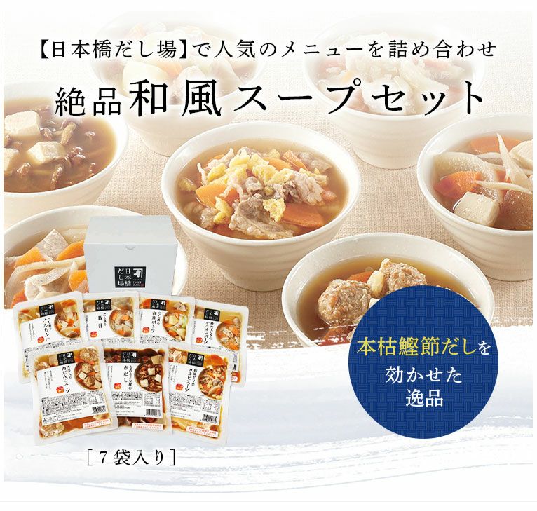 他の画像を見る 冷凍便 税率8% 日本橋だし場の味をご家庭で 【日本橋だし場】 だしスープ詰合せ 7袋入り (送料無料) <冷凍・Y> 販売価格: ¥ 5,400 税込 詳細を見る お気に入りに登録する