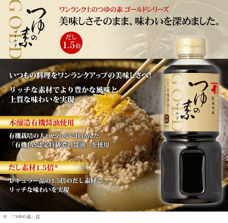 他の画像を見る 常温便 税率8% ケース商品 つゆの素ゴールド(3倍濃厚)500ml×12本・ケース入り(送料無料)<常温・O> 通常価格: ¥ 9,396 のところ 販売価格: ¥ 7,500 税込 カートに入れる お気に入りに登録する